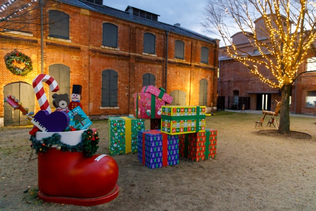 冬の夜には、レンガの壁や木々がやわらかなイルミネーションで照らされ、レトロで落ち着いた雰囲気の空間が広がります。